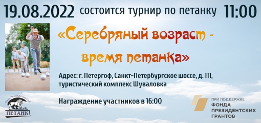 Финальное мероприятие проекта «Серебряный возраст — время петанка», поддержанный Фондом президентских грантов, состоялось! Турнир прошел в туристическом центре «Шуваловка» в Петергофе. Многие помнят это чудесное место, где несколько лет подряд проходил петергофский турнир!