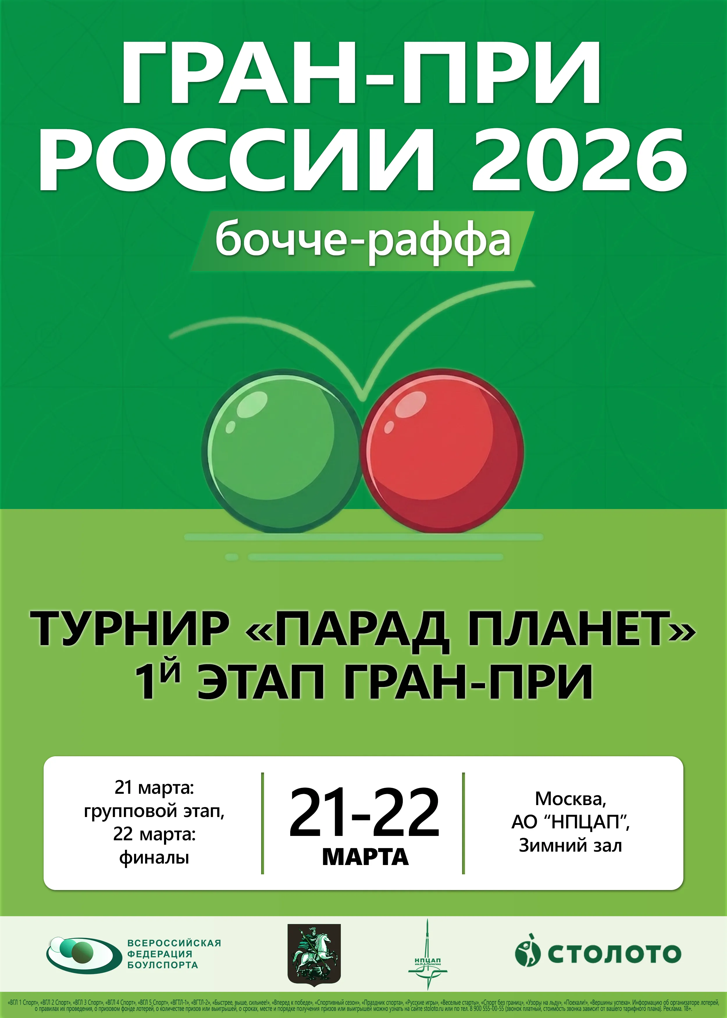 Чемпионат Всероссийской федерации боулспорта «Парад планет» 2026 в дисциплине «бочче-раффа» прошел 21-22 марта на зимнем боччедроме Центра Пилюгина в Москве. В соревнованиях приняли участие 52 спортсмена (27 женщин и 25 мужчин) из семи регионов России: Москвы, Санкт-Петербурга, Республики Удмуртия, Московской, Тульской, Владимирской и Брянской областей.