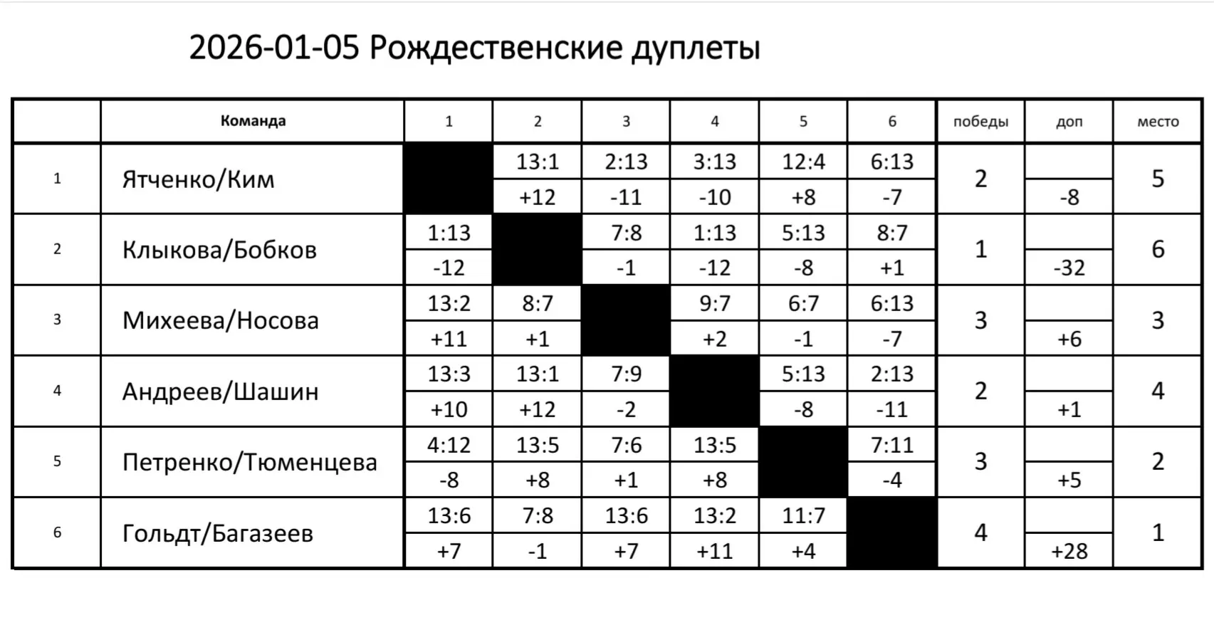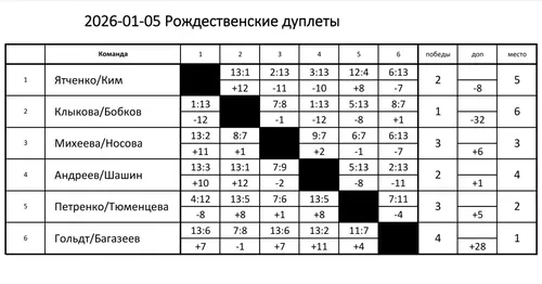 Традиционный турнир по петанку «Рождественские дуплеты» состоялся 5 января 2026 года в Томском петанк-клубе. В соревнованиях приняли участие шесть местных пар, которые сыграли между собой по круговой системе по пять игр каждая.