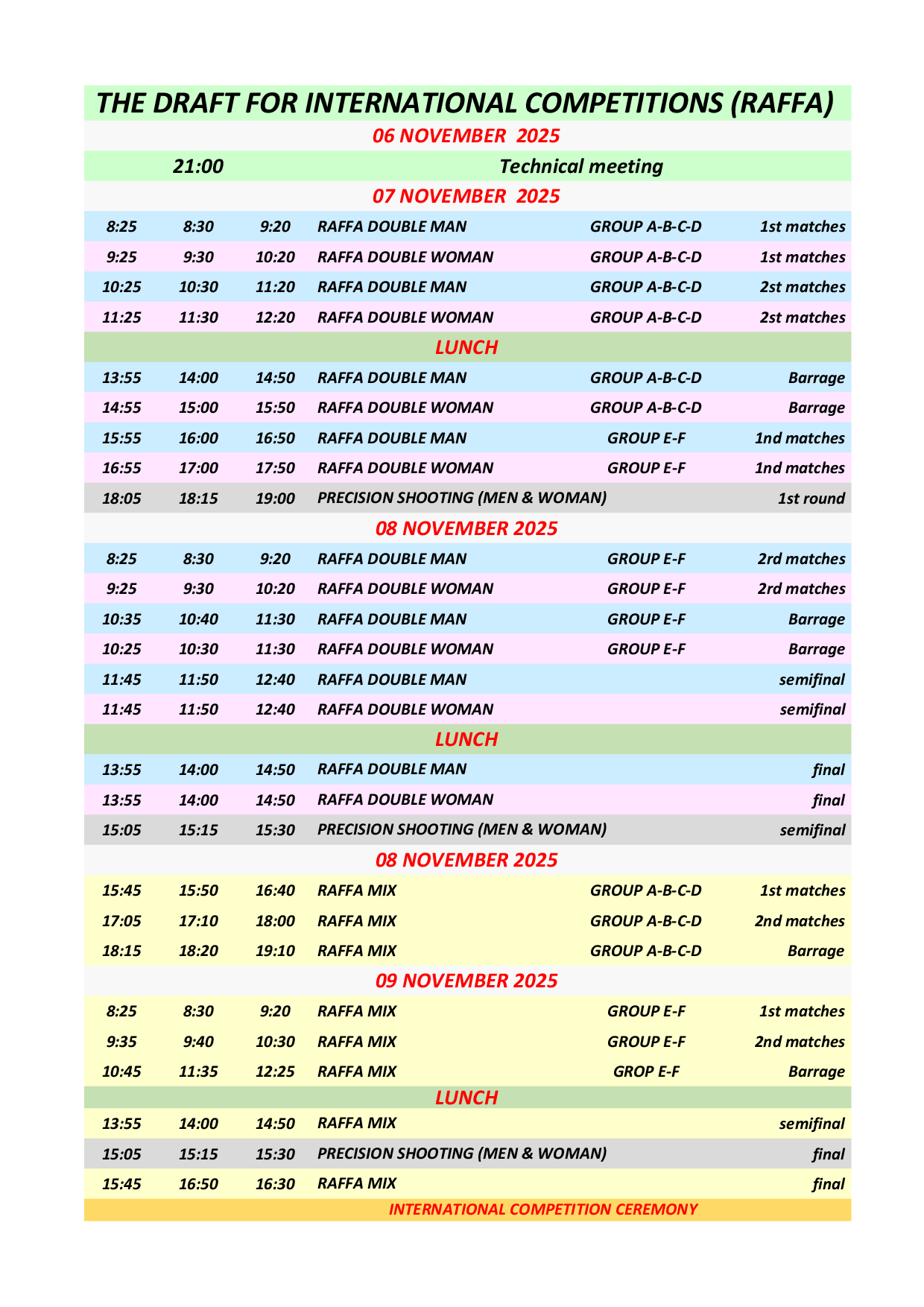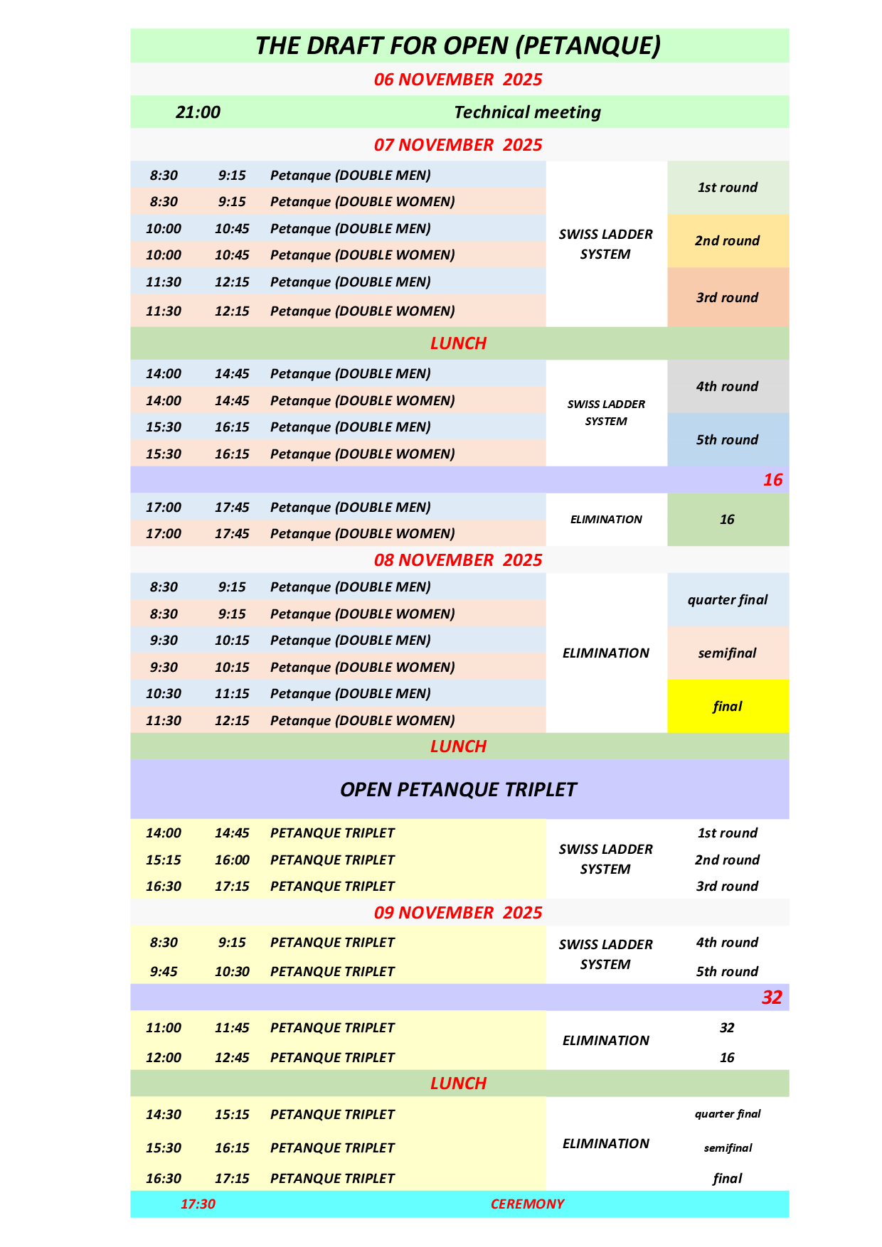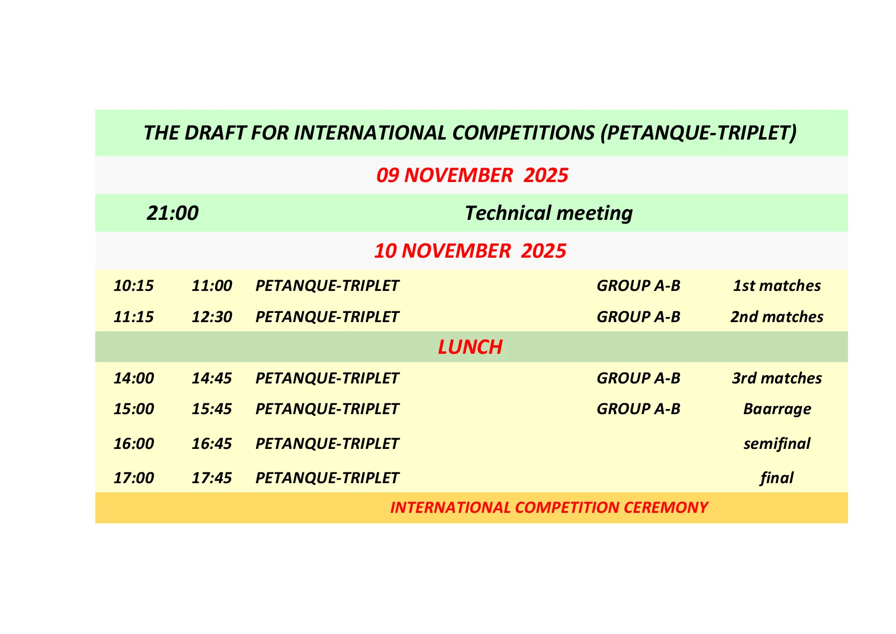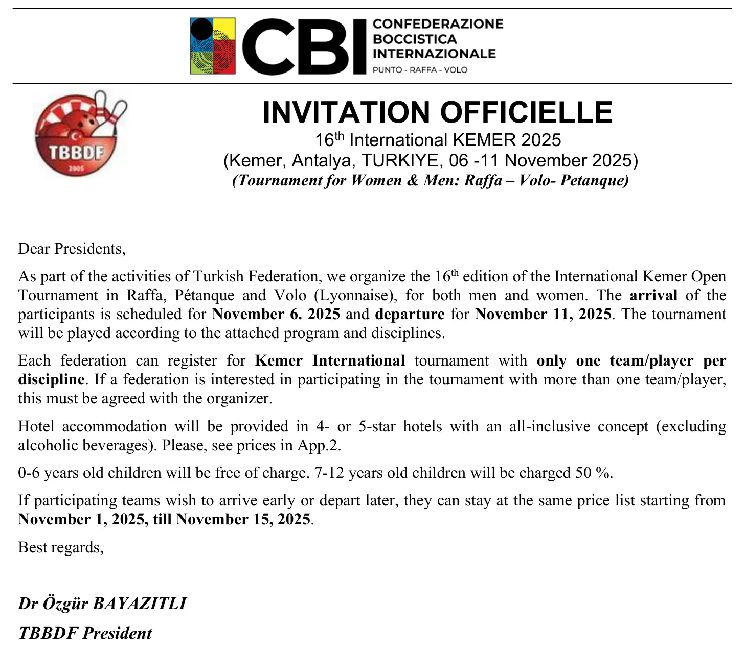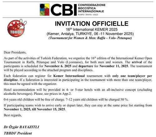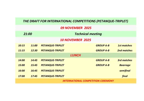 Соревнования Kemer Open петанк, Kemer International раффа и Kemer International воло будут проходить одновременно, одни и те же спортсмены смогут участвовать только в одном из них. Соревнования Kemer International петанк будут проходить в другое время.