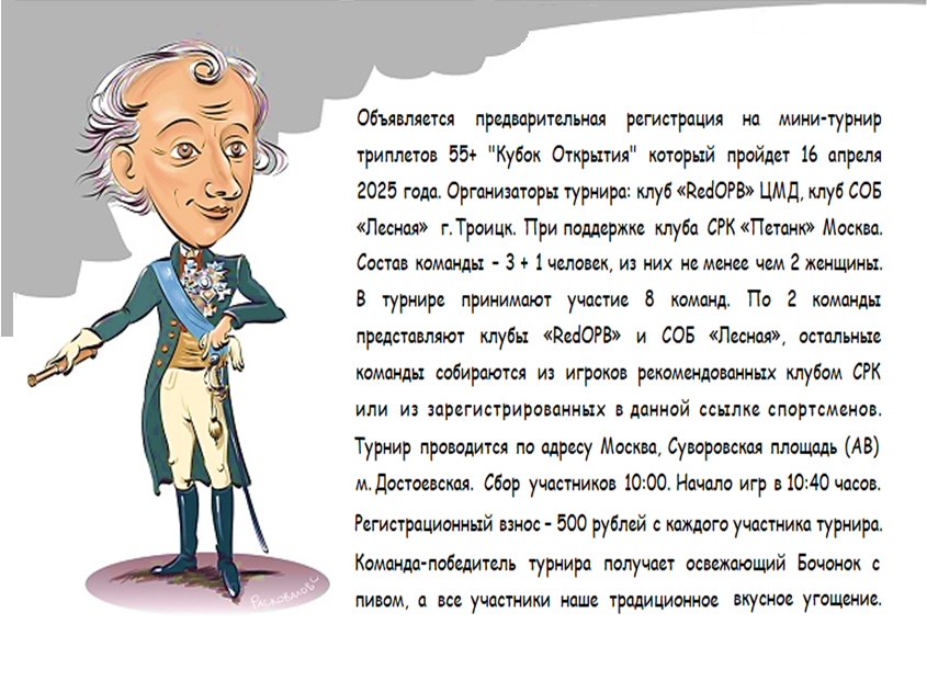 Открыта предварительная регистрация на мини-турнир триплетов 55+ «Кубок Открытия», который пройдет 16 апреля 2025 года.