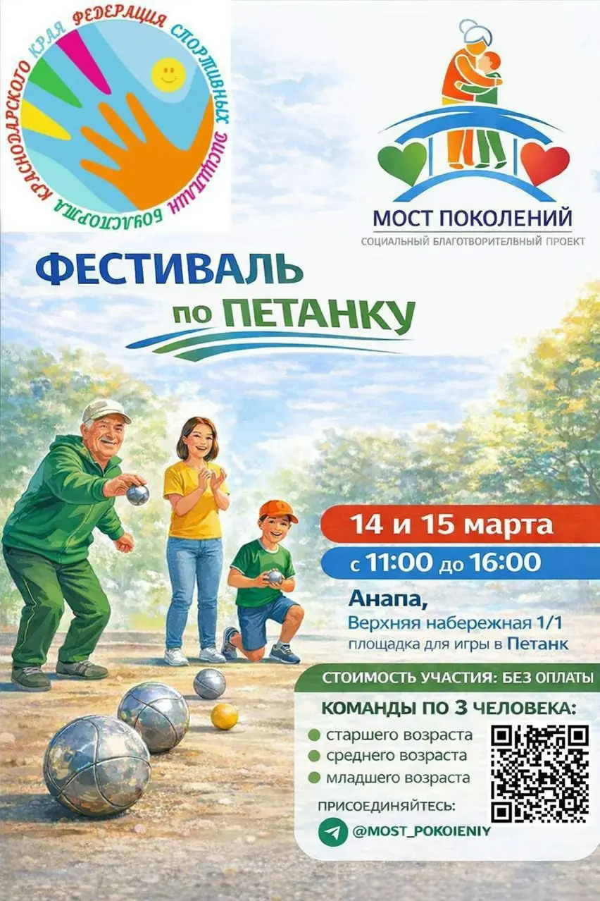 В Анапе 14-15 марта 2026 года на петанк-площадке клуба «Белая шляпа» (ул. Верхняя набережная, 1/1) пройдет яркий спортивный фестиваль петанка в рамках проекта «Мост поколений». Это отличный шанс для семей и людей разного возраста провести время вместе за увлекательной игрой.
