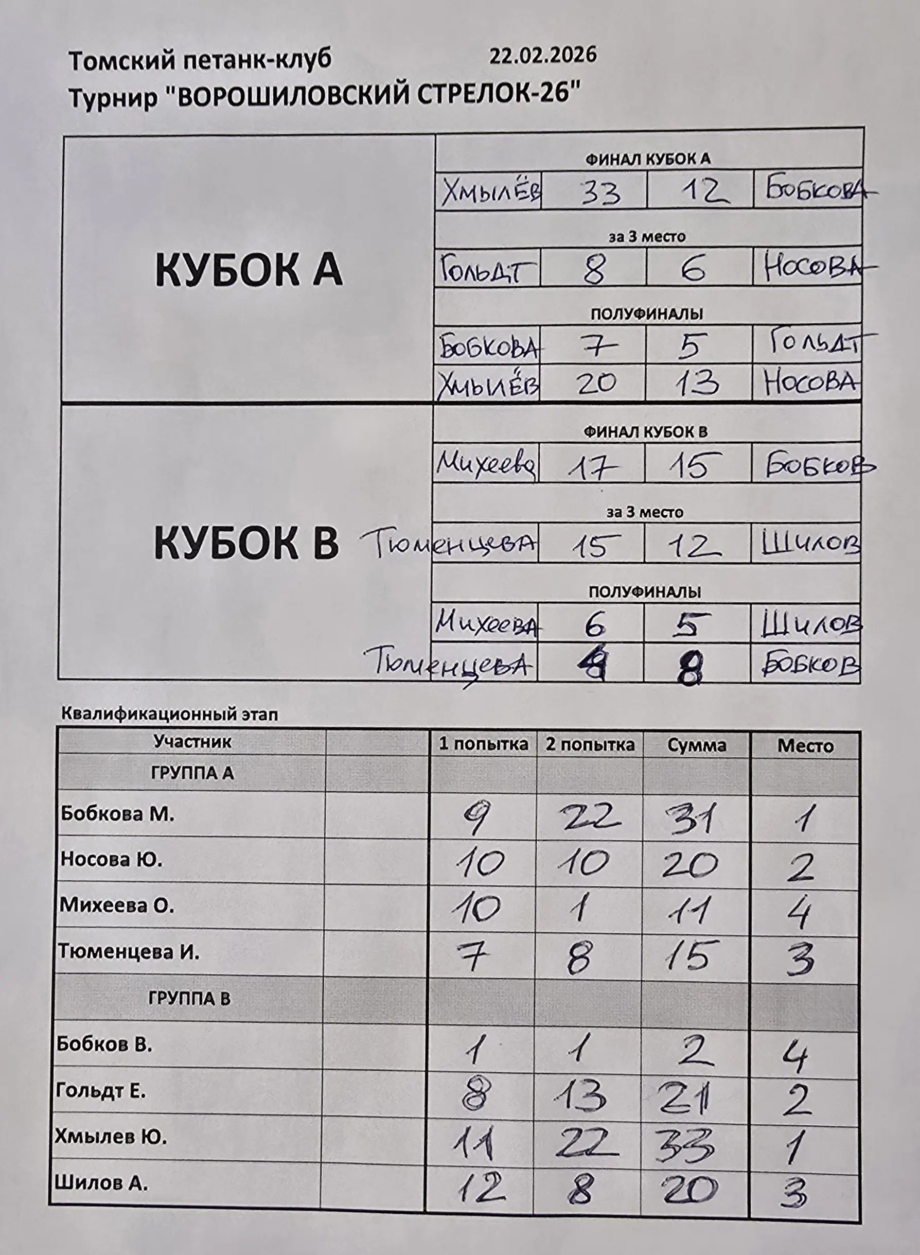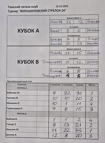 22 февраля 2026 года в Томском петанк-клубе состоялся традиционный турнир по тиру «Ворошиловский стрелок» в дисциплине «петанк-точность». В соревнованиях приняли участие восемь спортсменов. После квалификации, где участники были разделены на две равные гендерные группы, борьба продолжилась в объединенных Кубках А и В.